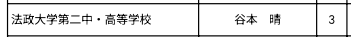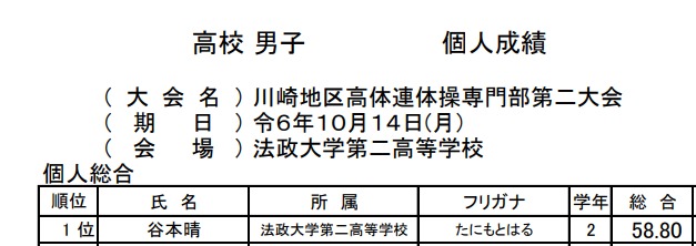 谷本晴さんの名前が、体操競技大会の結果表にあり、法政大学第二高校だとわかりました。